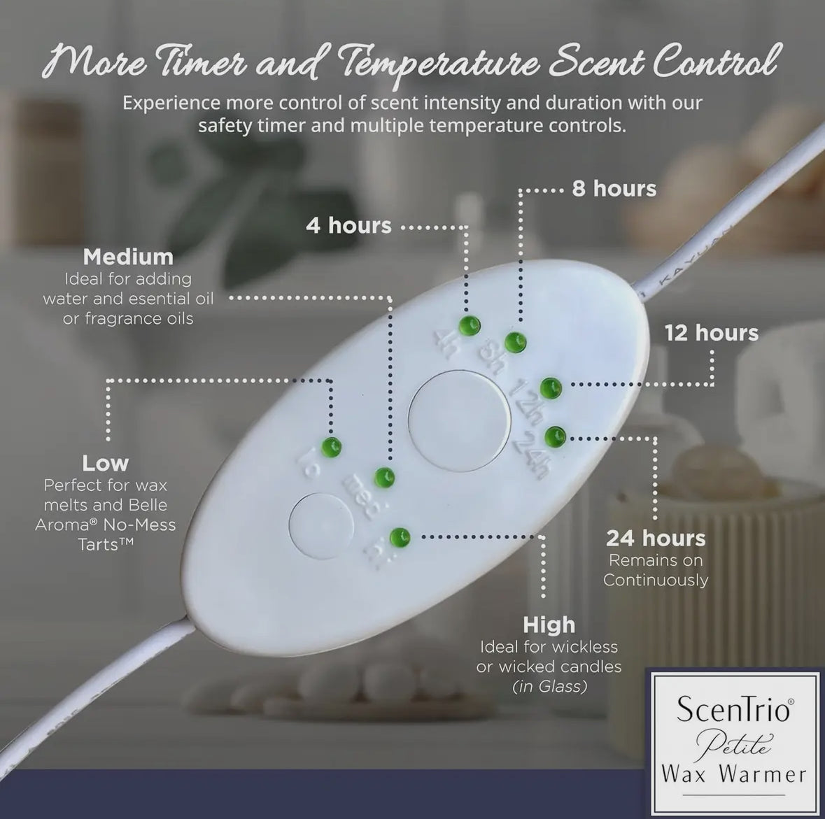 The ScenTrio® Petite is truly a top-of-the-line innovation in the world of fragrance warmers. This compact device delivers a better fragrance experience. Features: